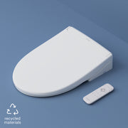 Full-scale luxury (in a super-slim design) The Swash Eco Thinline T66 Luxury Bidet Toilet Seat features a streamlined profile that guarantees to enhance any modern bathroom. At just under 4 inches high, it has a seamless appearance compared to bulkier electronic bidet seats, yet still delivers the cleanliness and comfort you deserve. Features include an endless warm water wash, heated seat, warm air dryer, activated carbon deodorization, and 3-color LED nightlight to light your way during evening bathroom visits. The self-cleaning, 5-position stainless steel nozzle offers a cleansing spray, with fully customizable water pressure and temperature.You'll love the low-profile, beautifully designed remote and programmable user settings, along with the sustainable footprint of this seat. We've added 10% recycled ABS plastic into the lid, remote, and docking station—an industry first.