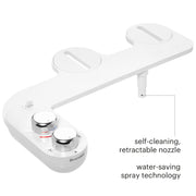 Take your personal hygiene to new heights. Brondell's SimpleSpa Eco Advanced Bidet Attachment delivers a front and rear wash, with adjustable water pressure and temperature. Control your wash using the convenient side-arm panel with attractive aluminum knobs and easy nozzle adjuster.We’ve integrated 65% recycled ABS plastic into the durable bidet frame, and added water-saving Nebia spray technology into the retractable nozzle. SimpleSpa Eco is engineered to reduce water usage without sacrificing pressure or cleansing power. It’s an attachment that installs easily beneath your existing toilet seat—and raises the bar on sustainability in the bathroom.Want a cool water wash only? Try our SimpleSpa Eco Essential Bidet Attachment.