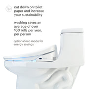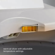 - Adjustable warm air dryer drastically reduces the need for wasteful toilet paper