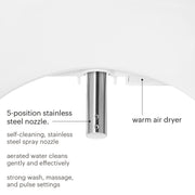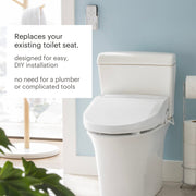 Add a splash of luxury to your bathroom with the Swash DR802 Advanced Bidet Toilet Seat. A stainless steel nozzle provides a satisfying, cleansing spray that you control. Enjoy high-end features, like a heated toilet seat to avoid a cold surprise when you sit, and an automatic deodorizer to keep your bathroom smelling fresh. Also includes adjustable water temperature and pressure, a warm air dryer, and a wireless remote control, so you can customize your perfect wash every time.