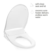 The Swash Thinline T44 Luxury Bidet Toilet Seat features a streamlined, low-profile design that guarantees to enhance any modern bathroom. At just under 4 inches high, it has a seamless appearance compared to bulkier electronic bidet seats, yet still delivers the cleanliness and comfort you deserve. Features include an endless warm water wash, heated seat, warm air dryer, activated carbon deodorization, and 3-color LED nightlight to light your way during evening bathroom visits. The self-cleaning, 5-position stainless steel nozzle offers a cleansing spray, with fully customizable water pressure and temperature. For added convenience, every aspect of your wash and dry is controlled using the intuitive wireless remote with programmable user settings.